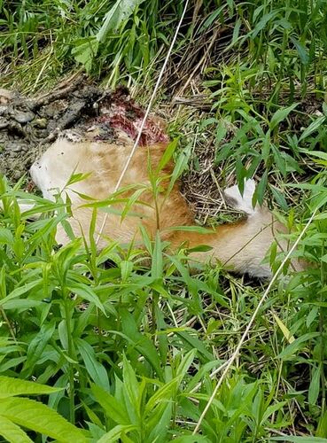 にほんブログ村 にほんブログ村 ヒグマに下半身を食べられたエゾシカの無惨写真 2016-6-19 北海道穂別町にヒメウスバシロチョウとウスバシロチョウの交雑状況を調査にいった高木氏はヒグマに下半身を食べられた(おそらくまだ食いかけの)エゾシカの無惨な姿…