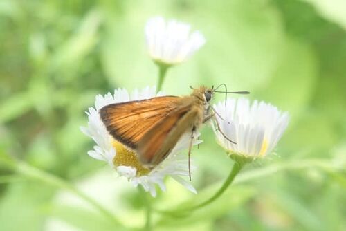 にほんブログ村 ヒメジョオンの群落に群れるカラフトセセリ。 2023-7-7( 金 )晴れ この日、旬のヤマベを釣りに北見市近郊の渓流に出かけた。 国道をはなれ林道に近づくと路傍に10m四方くらいのヒメジョオンの花満開の群落があり、ヒメシジミ、カバイロシジ…