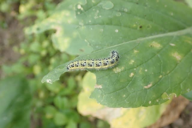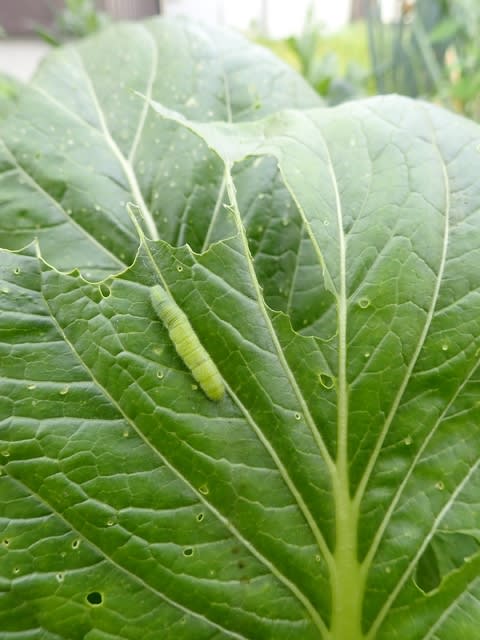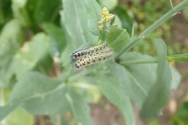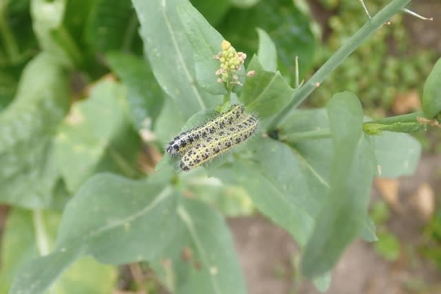 この時期、裏の家庭菜園のアブラナ科植物にはオオモンシロチョウの幼虫が見られるので時々見て回ってきたが、今日、初めて確認しました。