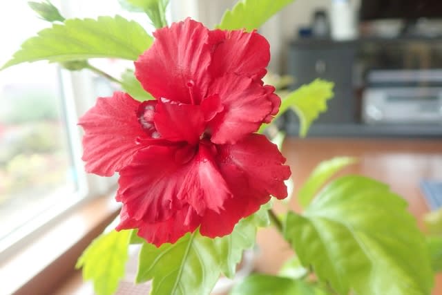 花芽が膨らむたびに花が開かないまま落下続けていたハイビスカスがやっと咲いた。