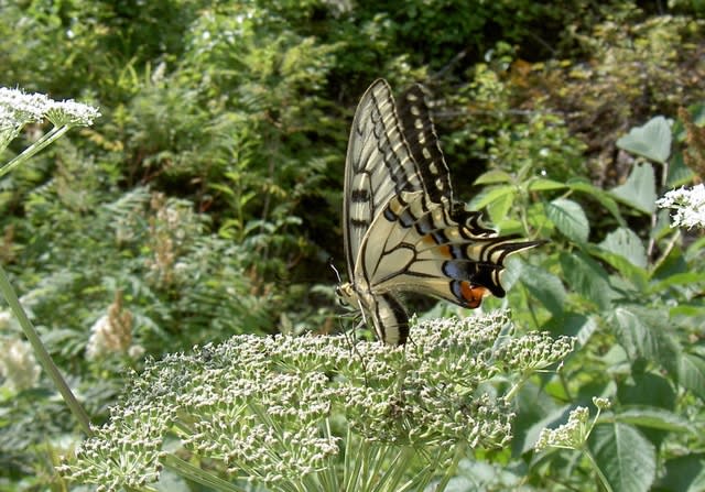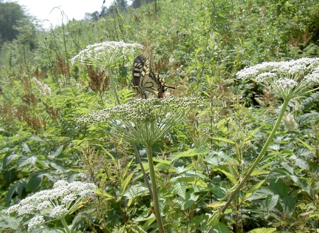 帰路、偶然に広い草原で満開のエゾニュウの花から花へせわしく飛びながら、産卵しているキアゲハ1メスを発見。
