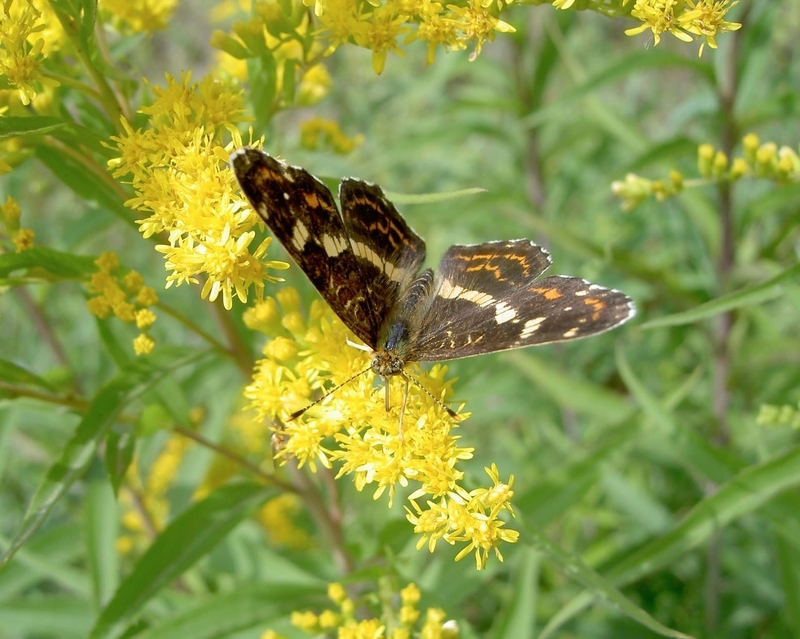 多数のサカハチチョウ2化が黄色い花満開の外来種セイタカアワダチソウの花に吸蜜中であったので撮影した。