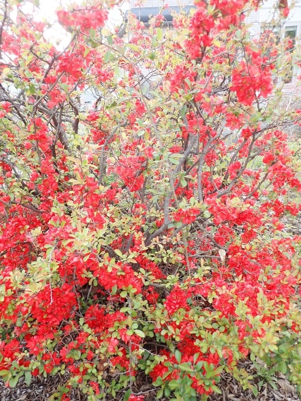 例年、多数のエゾシロチョウ幼虫に食害されて、満足に花をつけることも出来ないでいた赤ボケは今年は見事に咲いています。