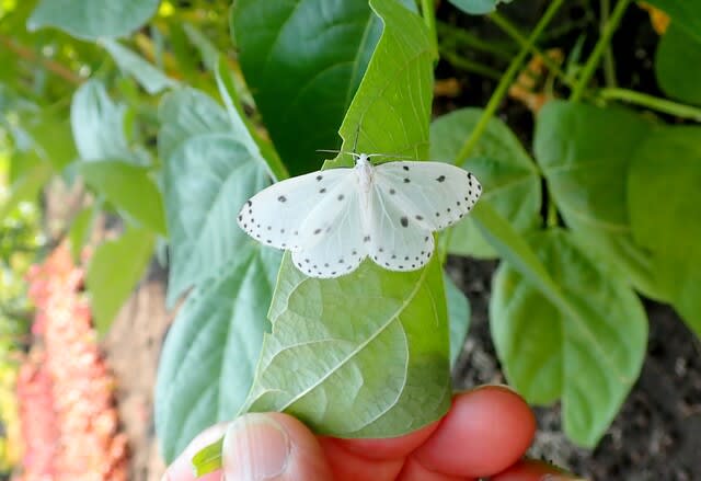 生まれて初めて見た昼飛性蛾だが、真っ白い羽根に鮮やかな黒色斑。