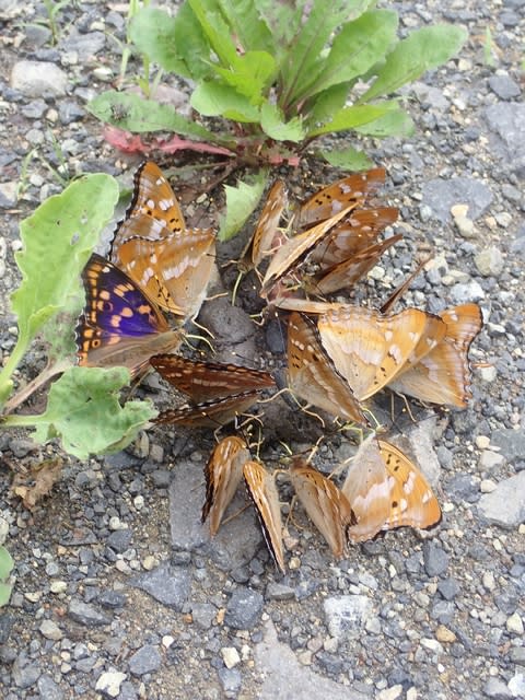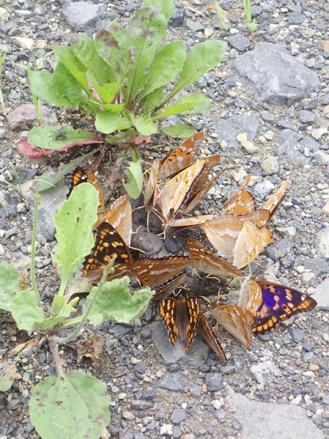 あちこちにコムラサキ♂の吸水集団がみられ車に驚き舞い散る様子は壮観だ。