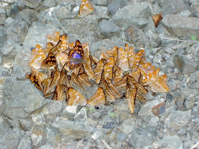 さて、この大集団は獣糞にあつまっているわけではなく、湿地や水分の多い場所に集まっているわけでもない。糞はなく、水たまりでもなく、獣の生乾き尿にでも集まっているのだろうか。