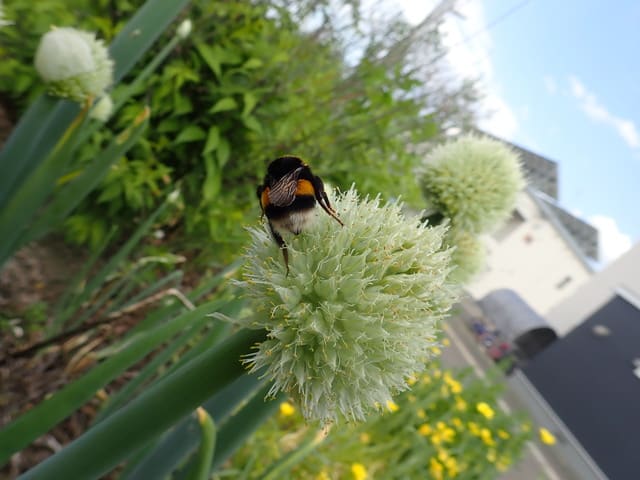 朝から良い天気。セイヨウオオマルハナバチが朝からブンブン羽音をたてて我が家の家庭菜園を元気良く飛びまわり、この日、初めてネギ坊主の白い花にきているのを観察しました。