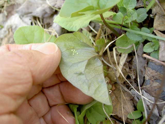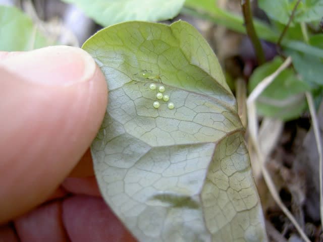 葉2枚 花1個に産卵を確認。真珠色の独特の卵が産み付けられていた。