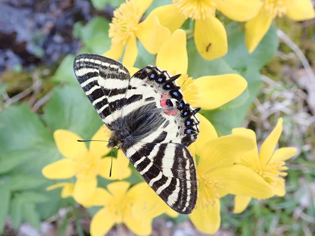 エゾノリュウキンカ(ヤチブキ)の黄色い花に吸密するエゾヒメギフチョウ♂。