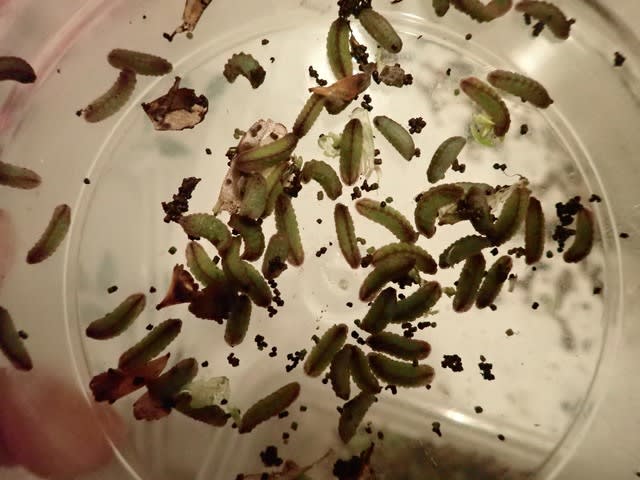 食べあまった食草とウンコのぐちゃぐちゃした中から、念入りにさがすと見落としていた幼虫が、さらにけっこう見つかる。