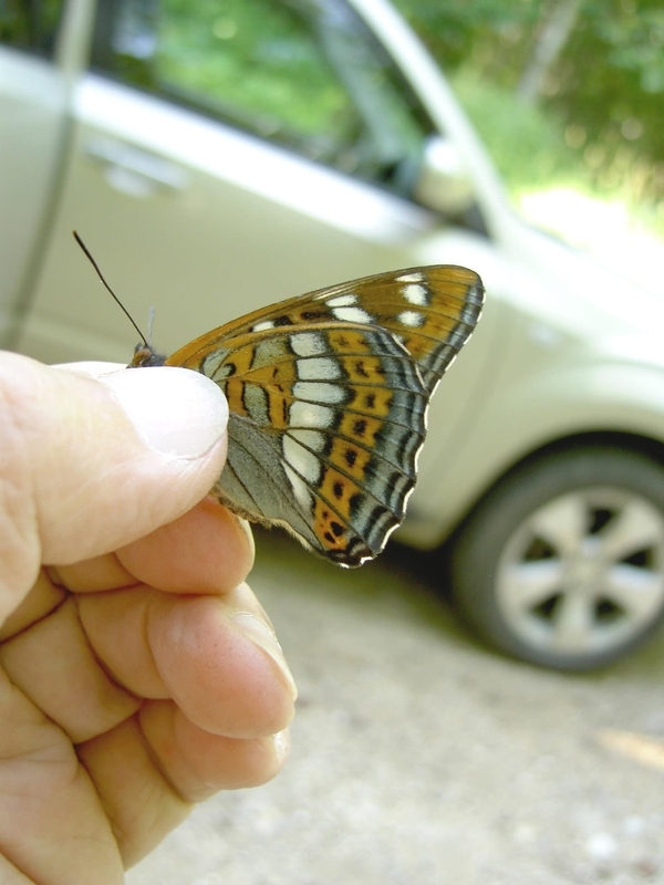渓流の最初の橋の近くに停車すると、どこからともなくオオイチモンジ♂が飛来し車の表面にある昆虫類が激突した跡などにせっせとストローを延ばしていた。
